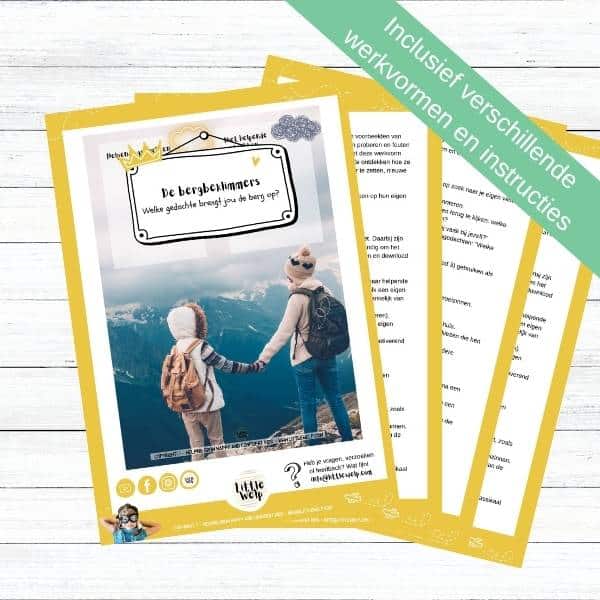 De Bergbeklimmers nodigt kinderen uit om met hun eigen gedachten op ontdekking te gaan. De berg staat symbool voor alles wat ze spannend of moeilijk vinden. Door deze metafoor te gebruiken, leren ze stilstaan bij wat hen tegenhoudt én wat hen juist helpt om verder te klimmen. De oefening is opgebouwd in verschillende vormen, zodat je ze zowel individueel, in duo als in groep kunt inzetten – telkens met ruimte voor reflectie, verbinding en groei.
